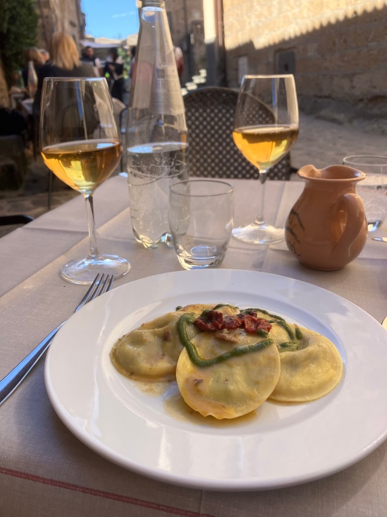 I enjoyed an excellent aubergine ravioli and a glass of local wine for under €20.